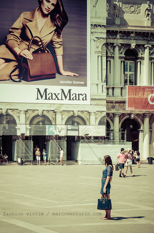 Una “fashion victim” che apprende i dettami per l’autunno-inverno da un grande manifesto. In realtà era in posa per una foto, ma la grande borsa e la cura degli abbinamenti la fatta diventare ai miei occhi una riproduzione estiva in miniatura della modella sul cartellone.