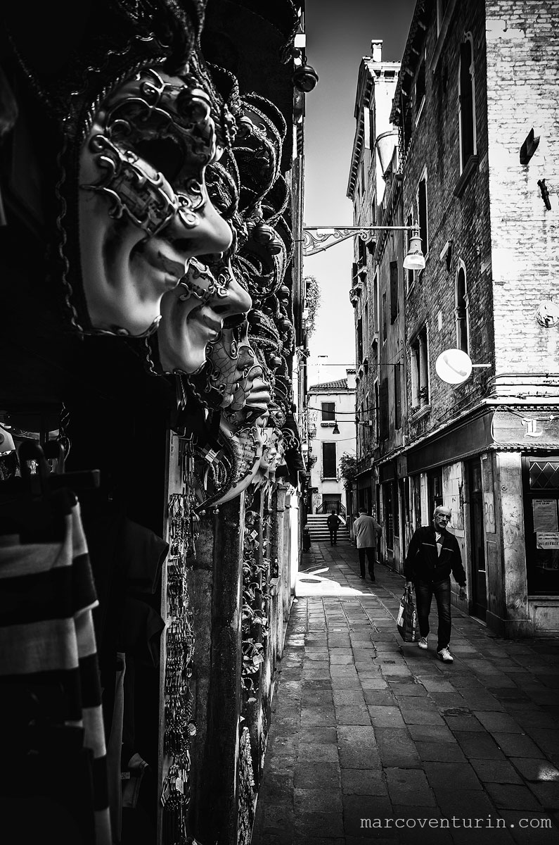 Le maschere veneziane da piccolo mi mettevano paura ed anche oggi mi danno un senso di inquietudine. Con il loro sorriso beffardo e lo sguardo vuoto hanno un chè di sinistro tanto che sembra controllino la gente che passa per le calli.